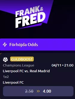 Erbjudande! Få Guldboost på förhöjt odds till 4 ggr pengarna för Liverpool vinst hos Frank & Fred