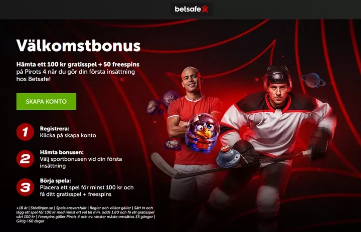 Betsafe erbjuder en 100 kr freebet på sport till alla nya spelare. Sätt in och satsa 100 kr på valfri sport till lägst oddset 1.80 så får du ett gratisspel av Betsafe. Du får dessutom 50 free spins i deras casino på spelautomaten Pirots 4 och dessa spinn är värda 1 kr/styck. Vinsterna från dessa spinn ska omsättas 35 ggr innan uttag.